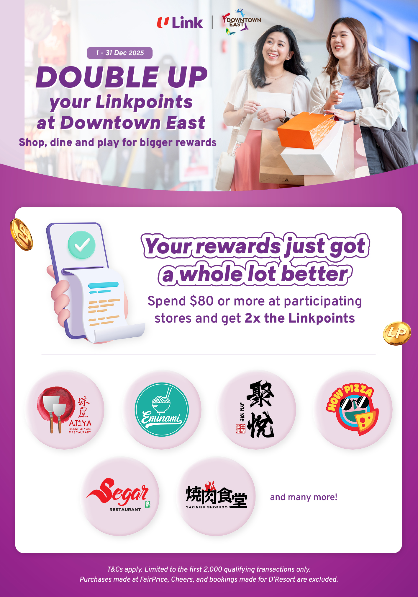 Simply spend $80 or more in a single transaction to qualify for double the Linkpoints. Limited to the first 2,000 qualifying transactions only. Other T&Cs apply.