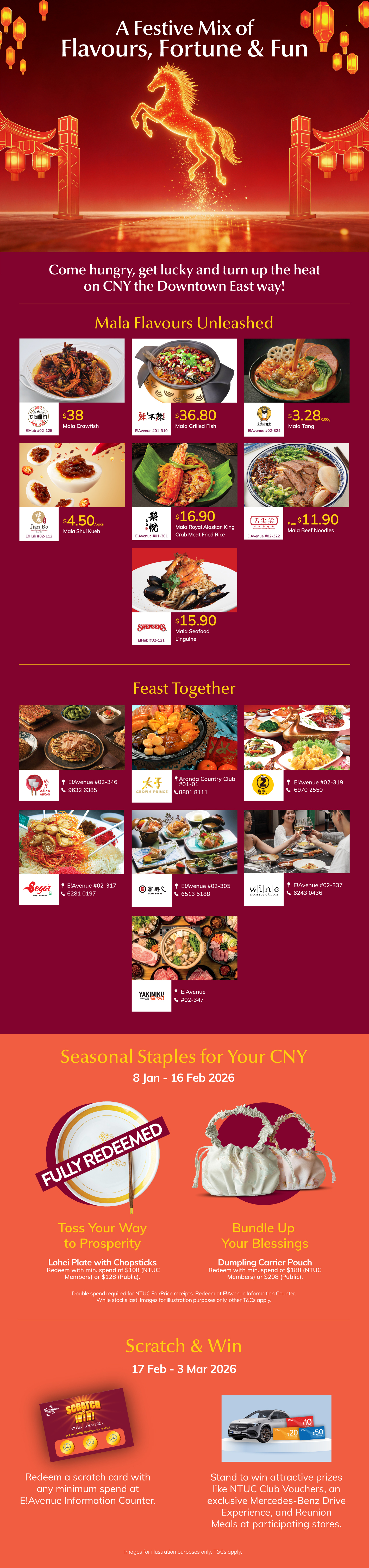 Celebrate the Lunar New Year season at Downtown East with a line-up that delivers on flavour and fun. Tuck into reunion dishes and mala specialties, enjoy exclusive gifts with purchase and stand a chance to win with scratch-and-win rewards as you dine and shop!