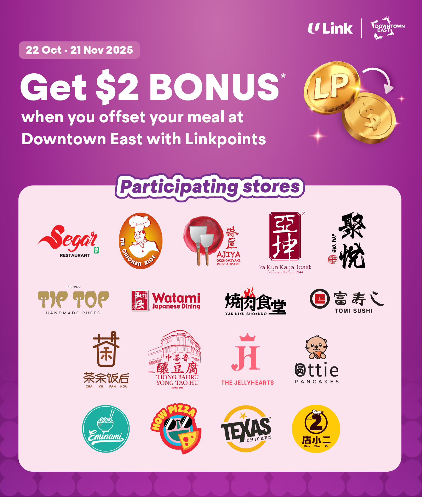 Redeem min. 200 Linkpoints in a single transaction at any of the following stores at Downtown East and earn 200 bonus Linkpoints worth $2!