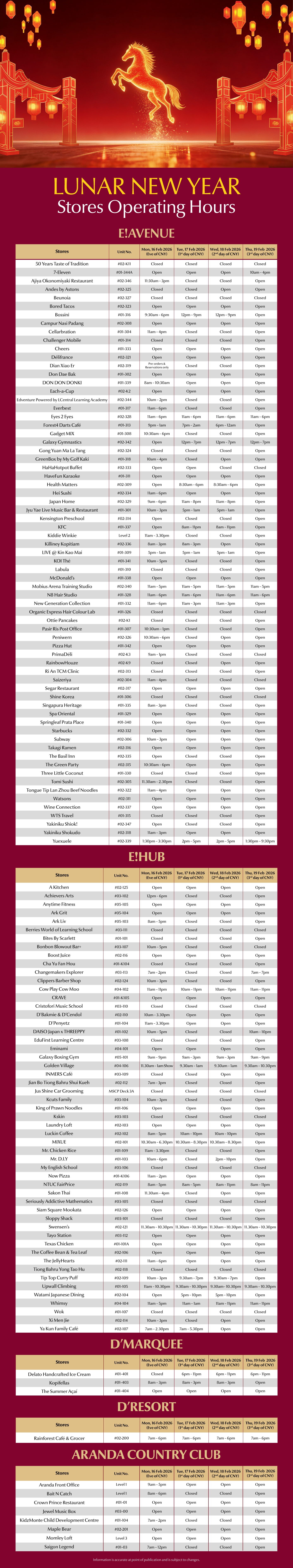 As we usher in the Year of the Horse, some stores will be adjusting their operating hours from CNY Eve through the 3rd Day of CNY.