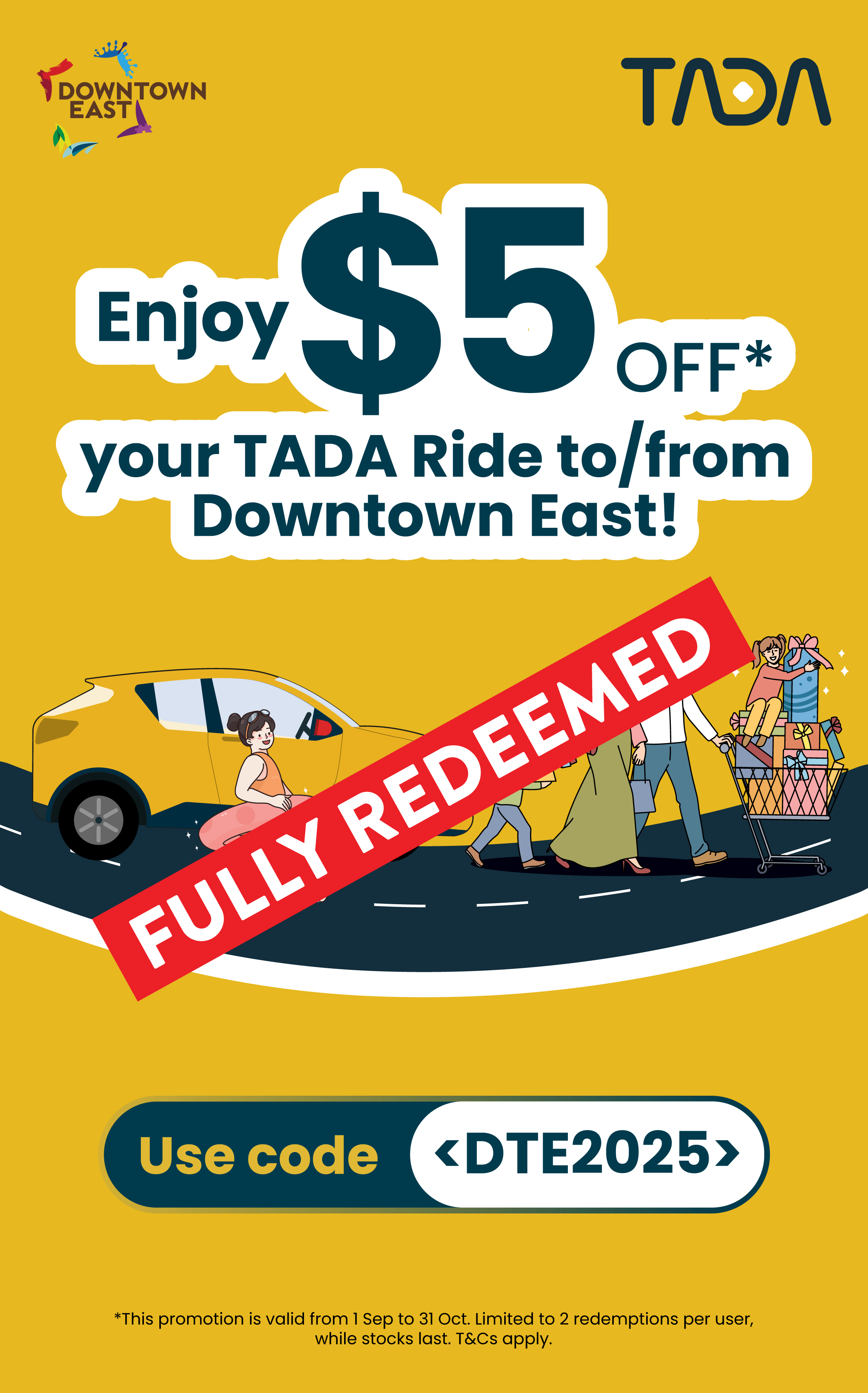 Get there the easy way! From 1 Sep to 31 Oct 2025, apply promo code <DTE2025> for $5 OFF* your TADA ride and spend more time enjoying the fun, bonding and maximising the delicious deals waiting for you!