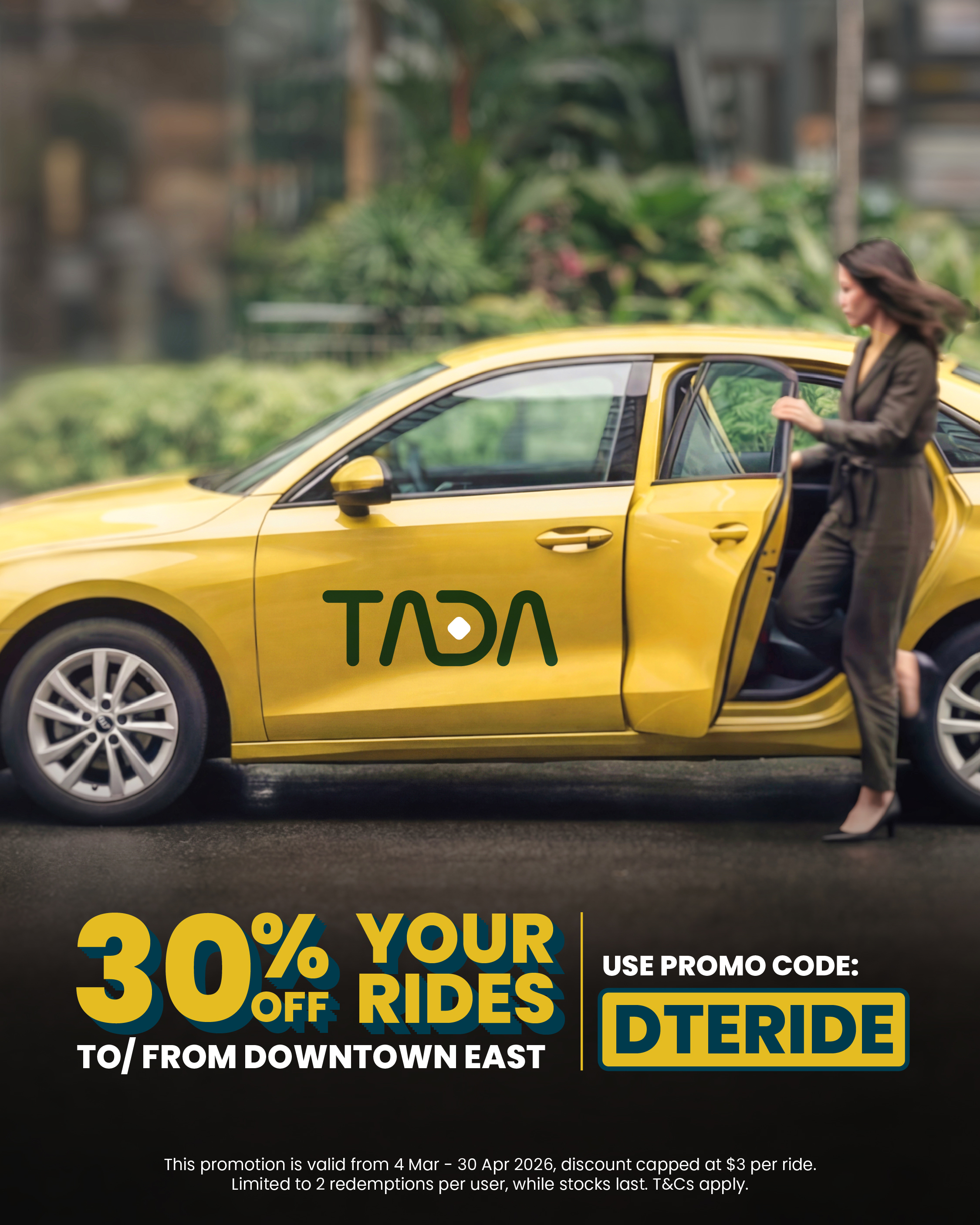 Arrive in comfort, skip the traffic and start your adventure conveniently! Use promo code <DTERIDE> for 30% OFF* TADA rides to and from Downtown East. Your journey should be as stress-free as your destination!