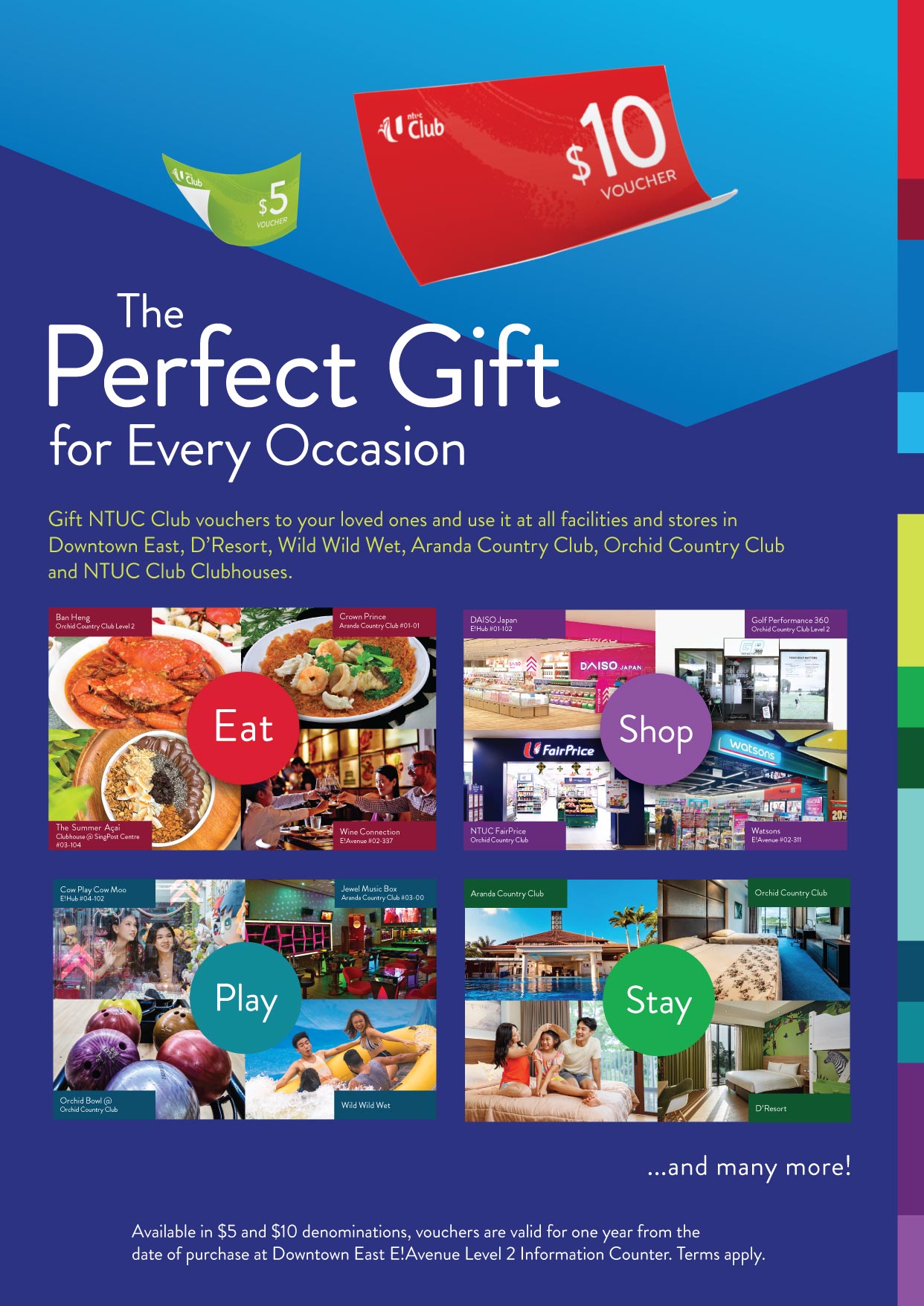 Gift NTUC Club vouchers to your loved ones and use it at all stores in Downtown East, Wild Wild Wet, D'Resort, Aranda Country Club, Orchid Country Club and NTUC Clubhouses!
